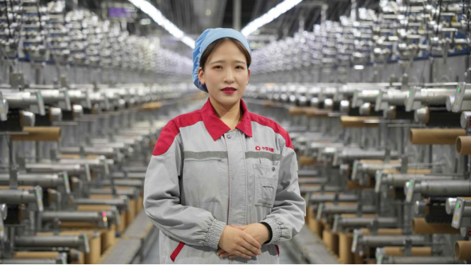 藏族员工贺顺花生长于青海互助,如今在碳丝分厂担任氧化炉工。她轻抚如发丝般闪亮的碳纤维,眼神专注:对她而言,守护产线,如同守护家乡的雪山一样神圣。